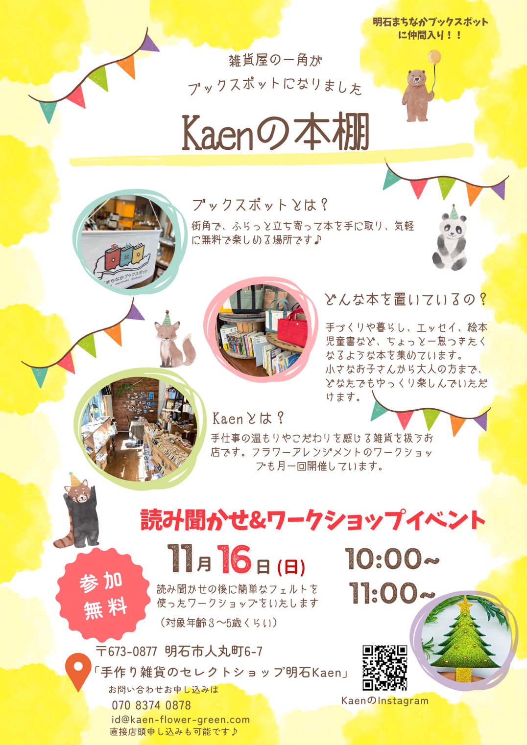 明石市立天文科学館近く人丸町にある「手作り雑貨のセレクトショップ明石Kaen」で、読み聞かせ&ワークショップイベントが2025年11月16日(日)に開催されます!