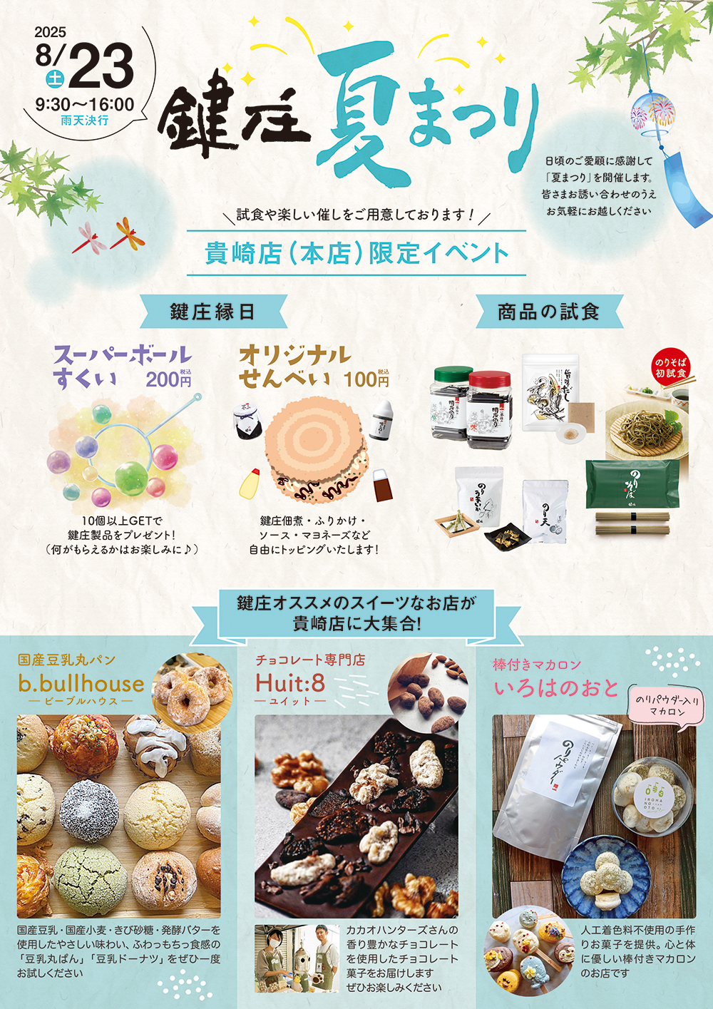 鍵庄夏まつりでは各直営店でイベント特別価格の商品が販売される他、貴崎店(本店)限定で「b.bullhouse」・「Huit:8」・「棒付きマカロン いろはのおと」の鍵庄セレクトショップの販売会が実施されます。本店では他にものりそばの試食や鍵庄縁日なども開催されるので要チェックですね!