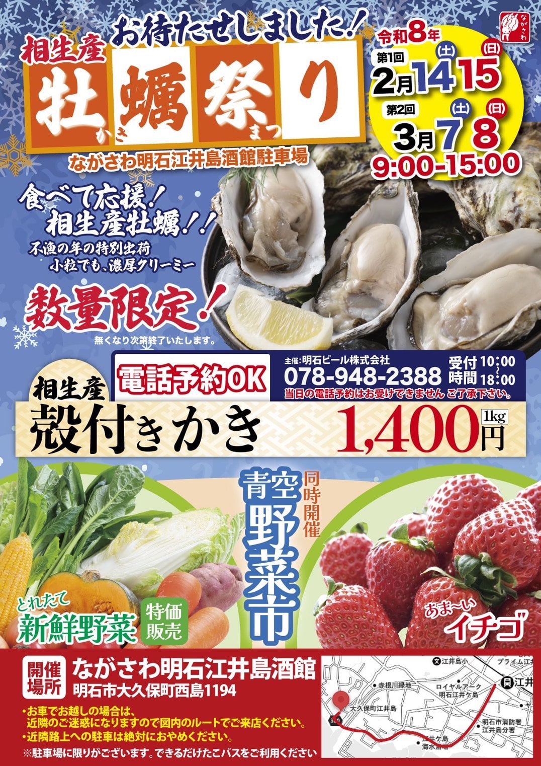 江井ヶ島にある「ながさわ明石江井ヶ島酒館(明石ブルワリー)」の駐車場で相生産 牡蠣祭りが2026年2月14日(土)・15日(日)、3月7日(土)・8日(日)に開催されます!