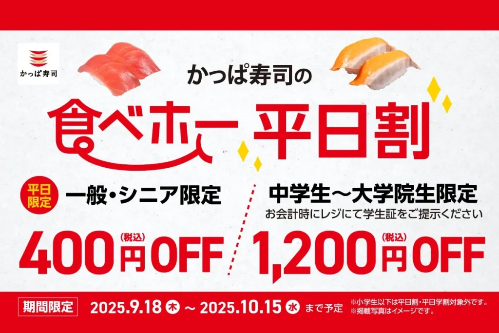 かっぱ寿司の食べ放題企画「かっぱ寿司の食べホー」の平日割が10月15日まで延長に!400円OFFの平日割と800円OFFの平日学割