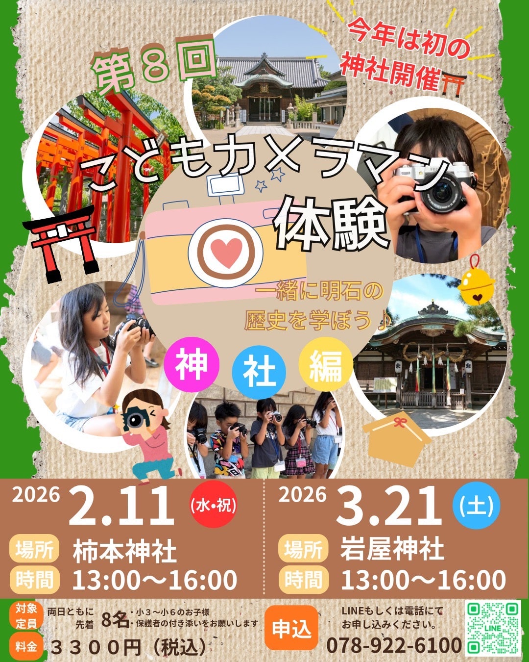 西明石南町にある写真館「阿那写真館 – PHOTO STUDIO ANA」によるこどもカメラマン体験教室 神社編が、2026年2月11日(水・祝)・3月21日(土)に開催されます!