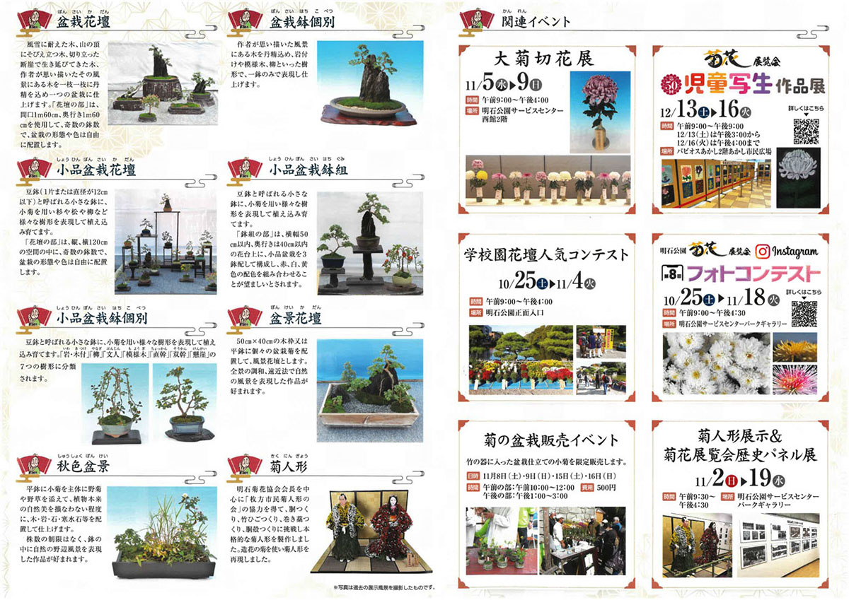明石公園の正面入口から中央園路にかけ、趣向を凝らした大菊、懸崖菊、福助菊、菊の盆栽などが展示されます!