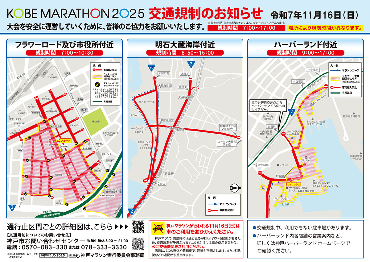 また、コース変更により、昨年と規制時間が変更になっている区間・エリアがありますので、「神戸マラソン2025 交通規制のお知らせ」をご確認のうえ、当日は、車のご利用をひかえて公共交通機関をご利用いただきますよう、ご協力をお願い申し上げます。