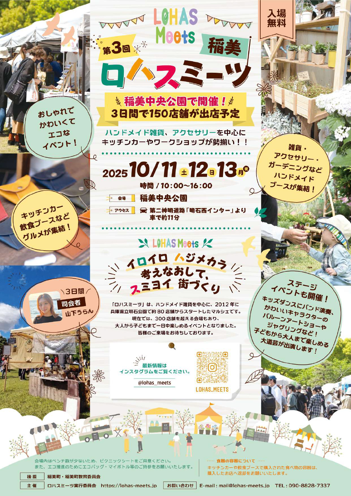 加古郡稲美町国安の「稲美中央公園」で「第3回 LOHAS Meets(ロハスミーツ)稲美」が2025年10月11日(土)~13日(月・祝)の3日間開催されます!