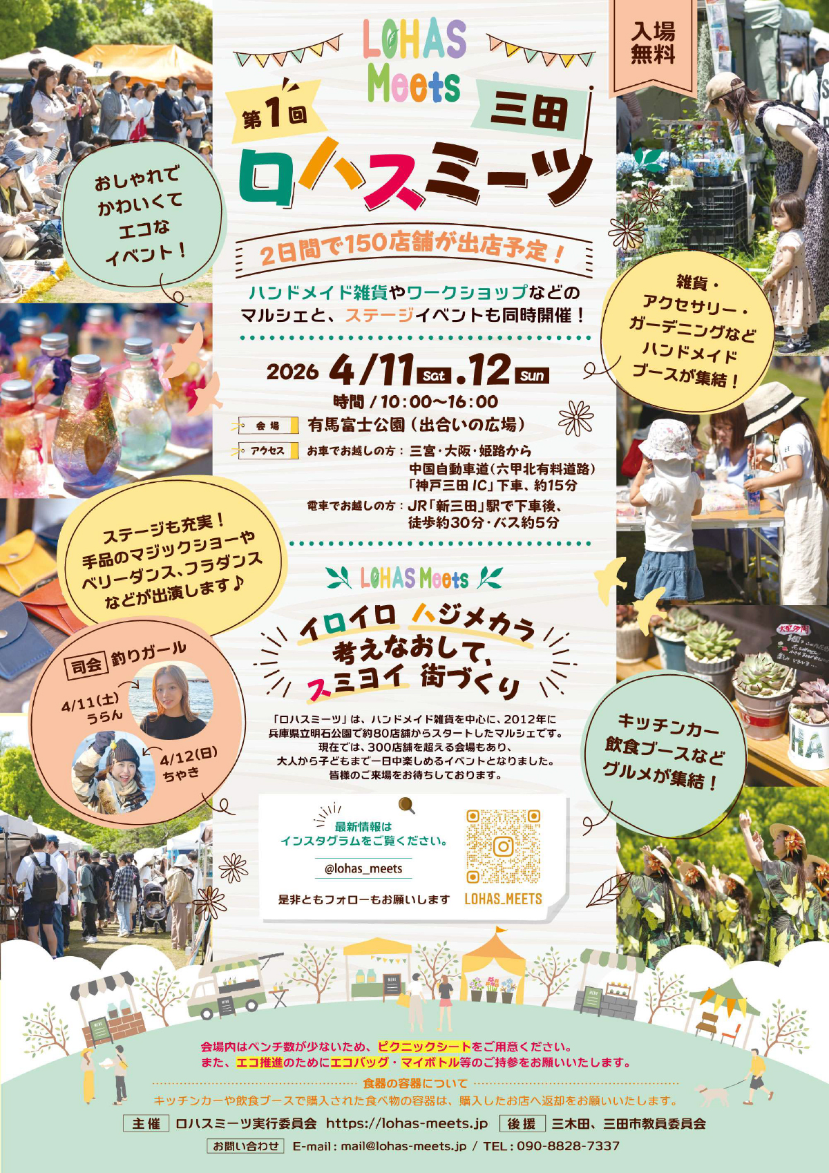 三田市福島にある「兵庫県立有馬富士公園」の出会いの広場で、初開催となる「第1回 ロハスミーツ三田」が2026年4月11日(土)・12日(日)の2日間開催されます!