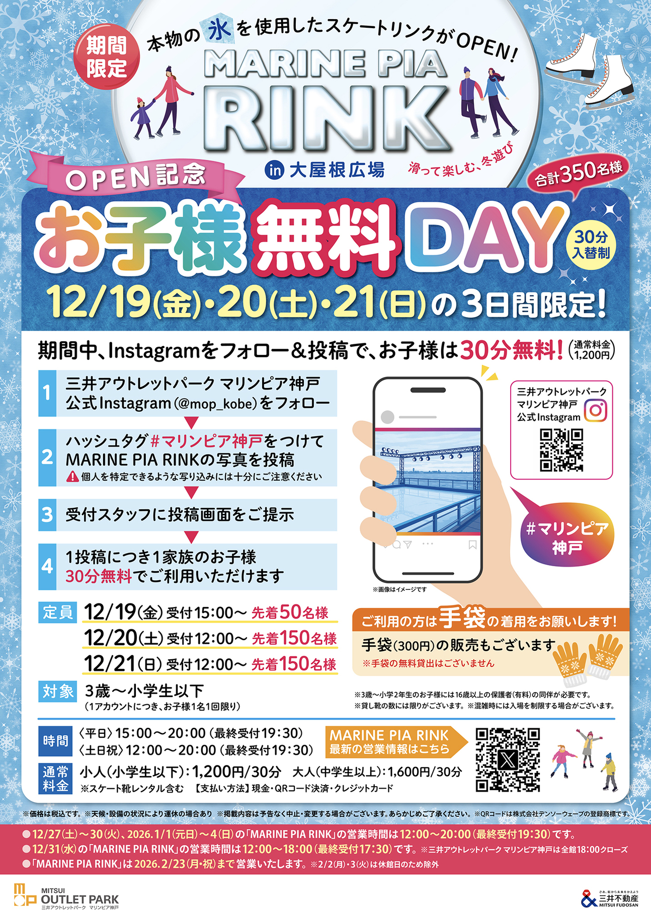 神戸市垂水区の「三井アウトレットパーク マリンピア神戸」で、2025年12月19日(金)~2026年2月23日(月・祝)の期間中にスケートリンク場「マリンピア神戸アイススケートリンク」がオープンします!