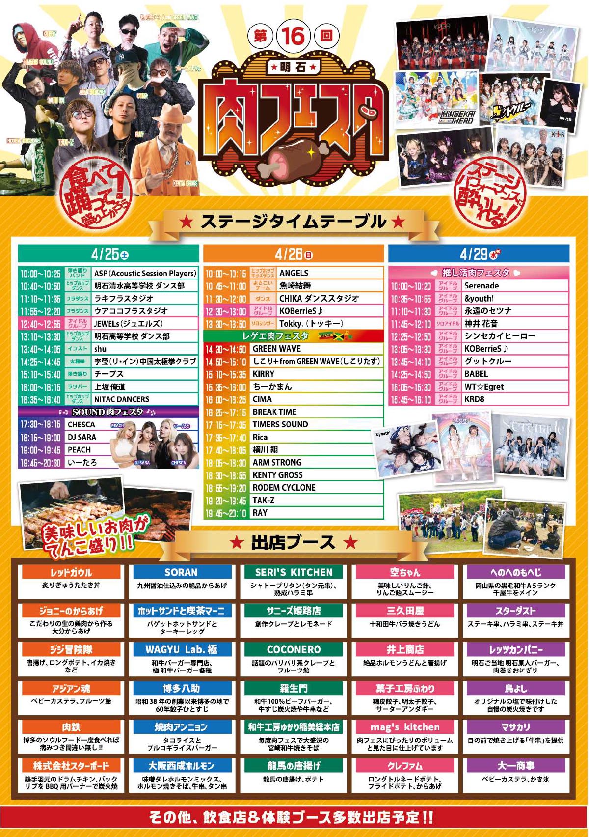 明石公園の西芝生広場で、肉とお酒と音楽とダンスのフェスティバル「第16回 明石肉フェスタ開催」が2026年4月25日(土)・26日(日)・29日(水・祝日)の3日間開催されます!