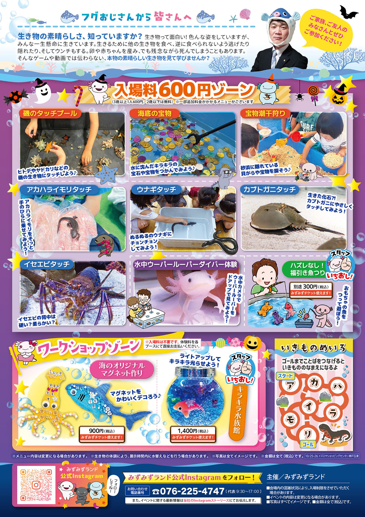 あそべ~る水族館みずみずランドのイベントページはこちら。入場料以外の有料コンテンツはLINE登録で値引きがあるので、参加予定であれば登録しておけばお得ですね!
