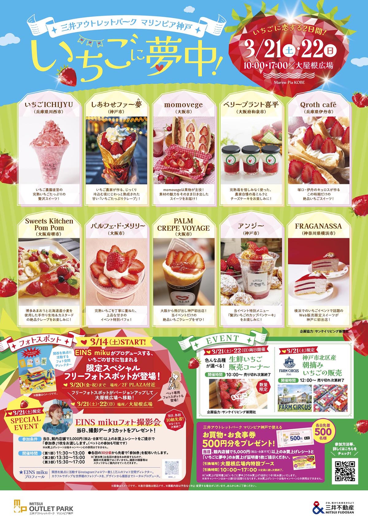 神戸市垂水区にある「三井アウトレットパーク マリンピア神戸」の大屋根広場で、人気のいちごショップが大集合するイベント「いちごに夢中!~いちごに恋する2日間~」が2026年3月21日(土)・22日(日)に開催されます!