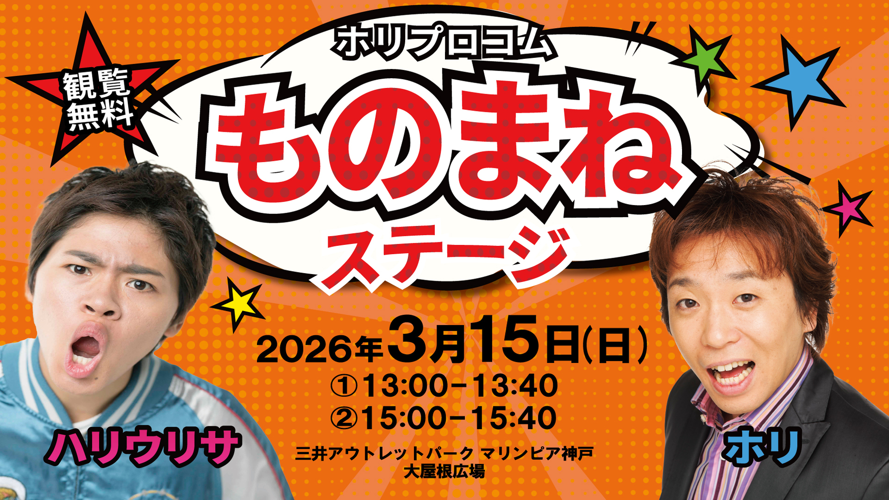 神戸市垂水区のアウトレットモール「三井アウトレットパーク マリンピア神戸」の大屋根広場で「ホリプロコム ものまねステージ」が2026年3月15日(日)に開催されます!