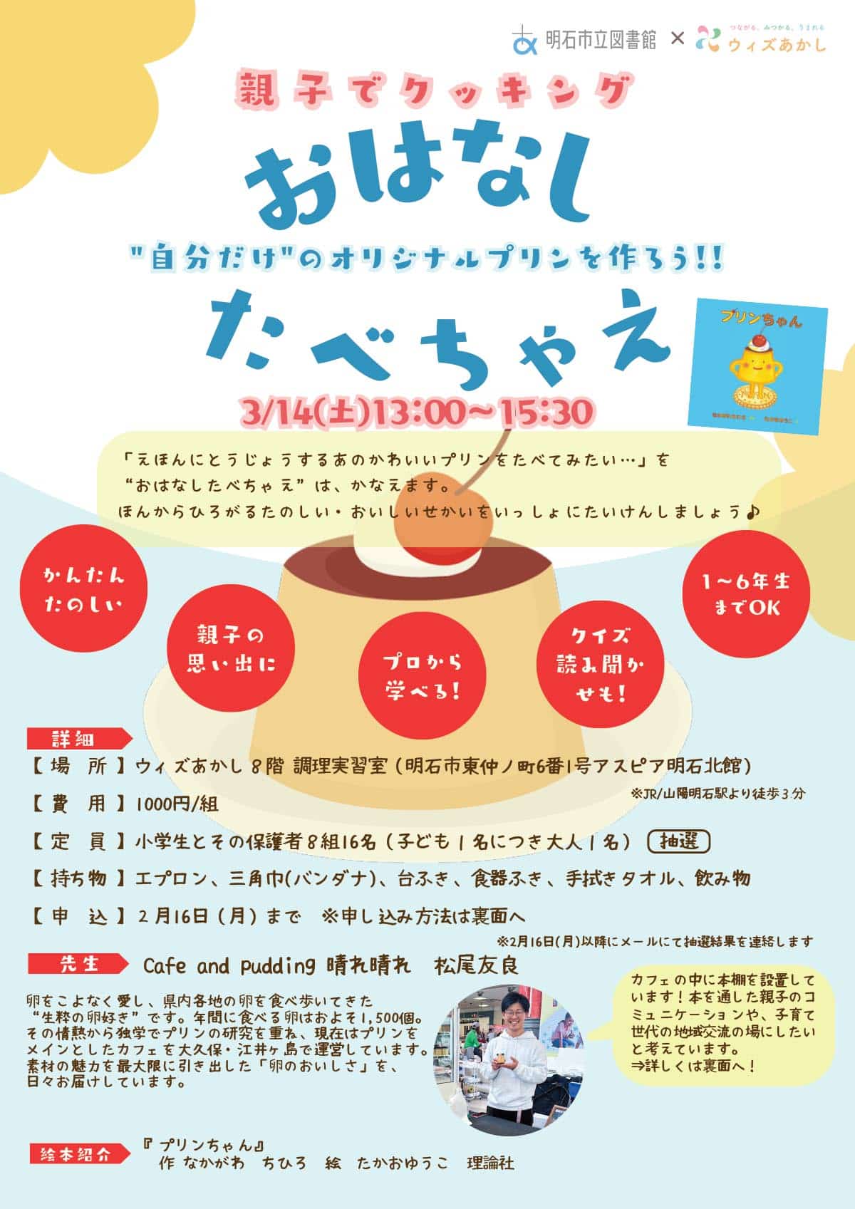 明石駅前の商業施設「アスピア明石」北館の「ウィズあかし」8階調理実習室で、小学生とその保護者を対象とした親子クッキングイベント「おはなしたべちゃえ~‟自分だけ”のオリジナルプリンを作ろう!!~」が2026年3月14日(土)に開催されます!