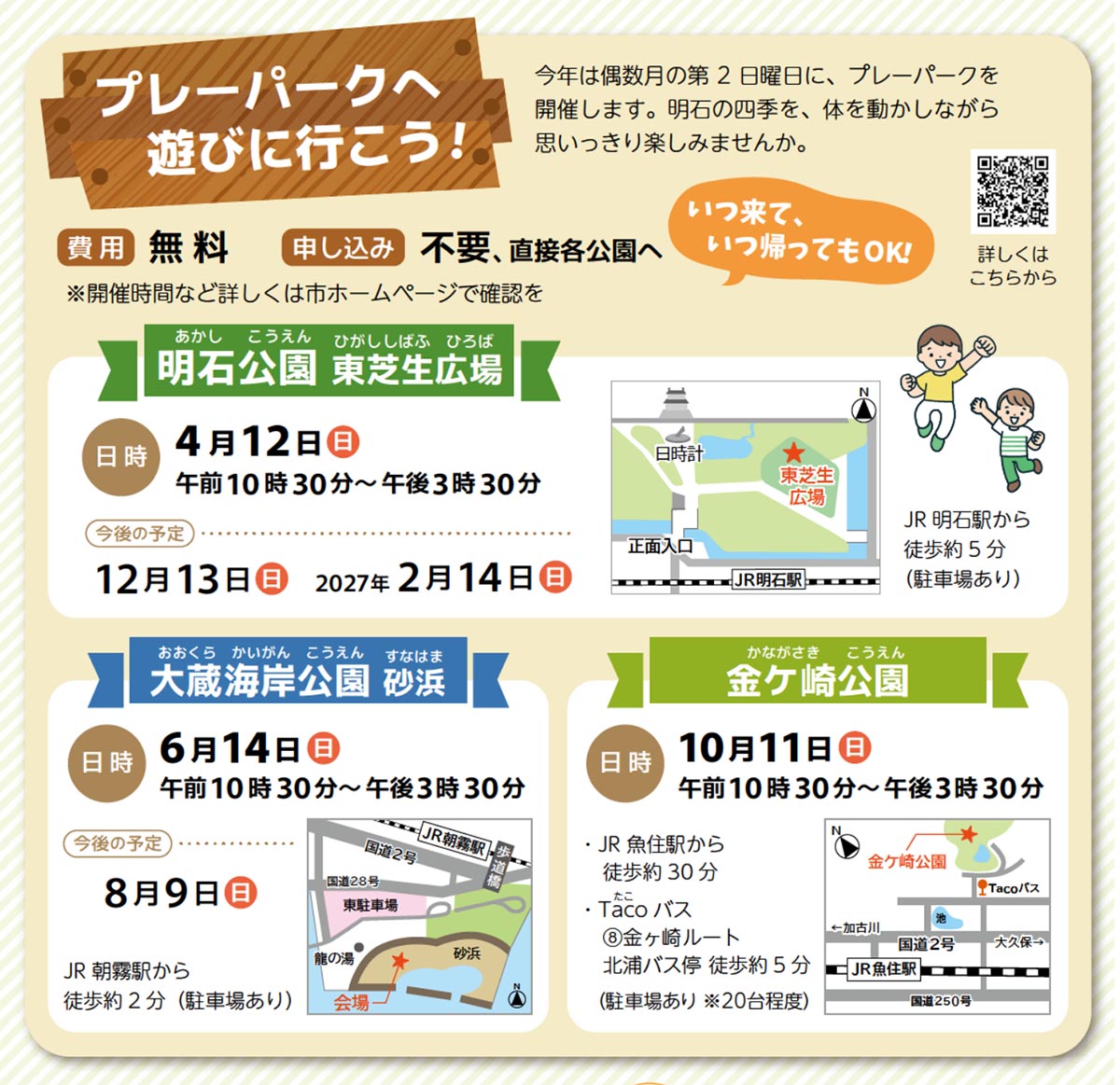 明石市内にある明石公園・大蔵海岸公園・金ケ崎公園で「あかしプレーパーク」が偶数月の第2日曜日に合計6回開催されます!
