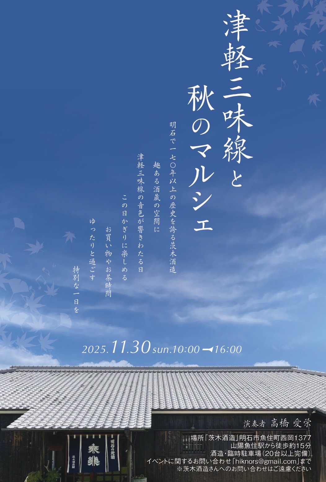 魚住町西岡の「茨木酒造」で「津軽三味線と秋のマルシェ」が2025年11月30日(日)に開催されます!