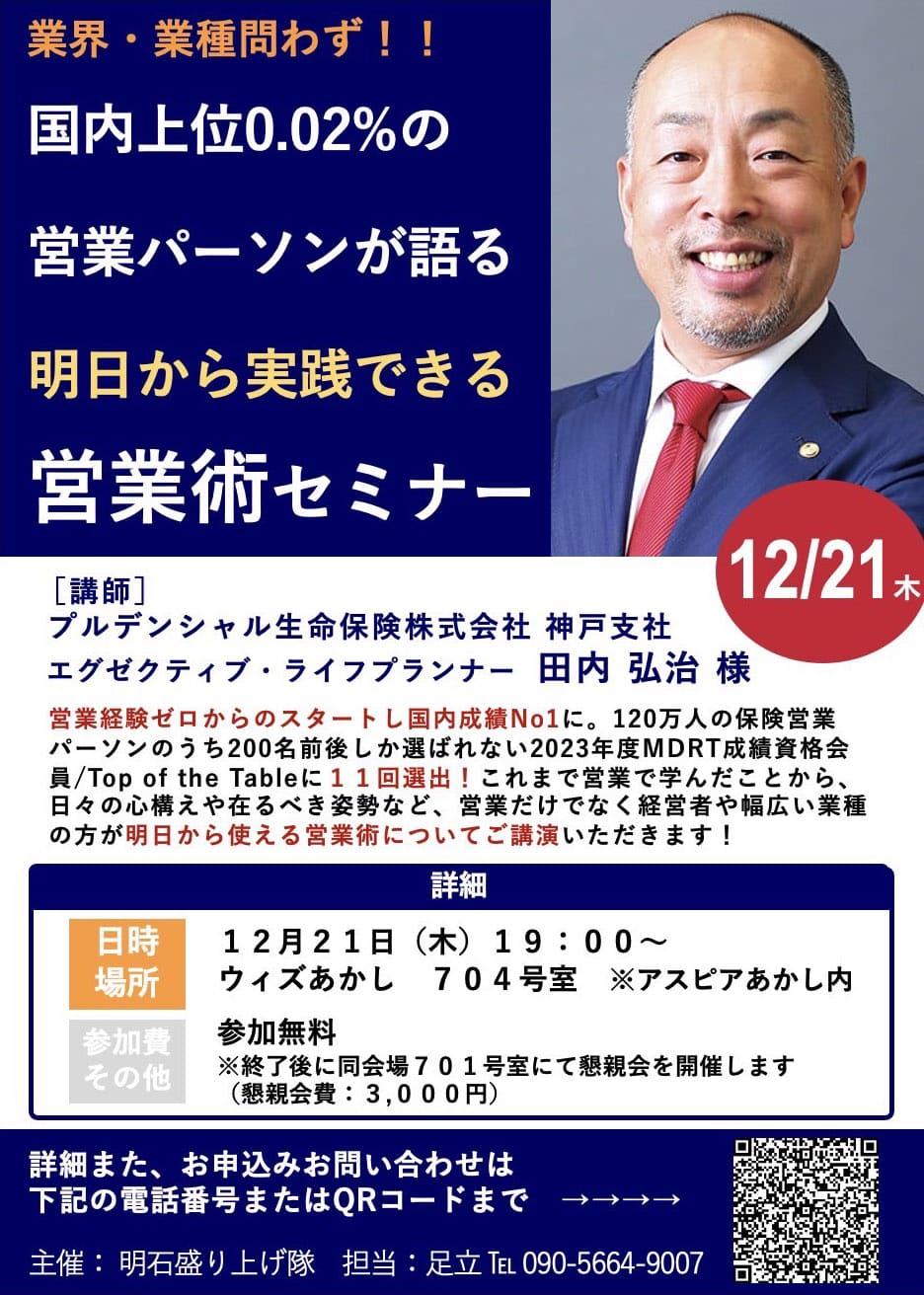 明石駅前の商業施設「アスピア明石」北館の「複合型交流拠点ウィズあかし」704号室で国内上位0.02%の営業パーソンが語る参加無料の「明日から実践できる営業術セミナー」が2023年12月21日(木)に開催されます!