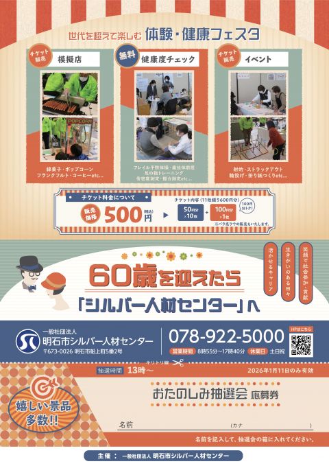 明石市シルバー人材センターによる「健康とふれあい」をテーマとしたイベントで、子ども向けのゲームを楽しめるイベントコーナーや、おやつ・スナックコーナーが勢揃いの模擬店、無料で体力測定・フレイル予防体操などができる健康度チェックコーナーなど、様々な趣向のブースが出展され、楽しみながら明石市シルバー人材センターを知ってもらうイベントとなっています!
