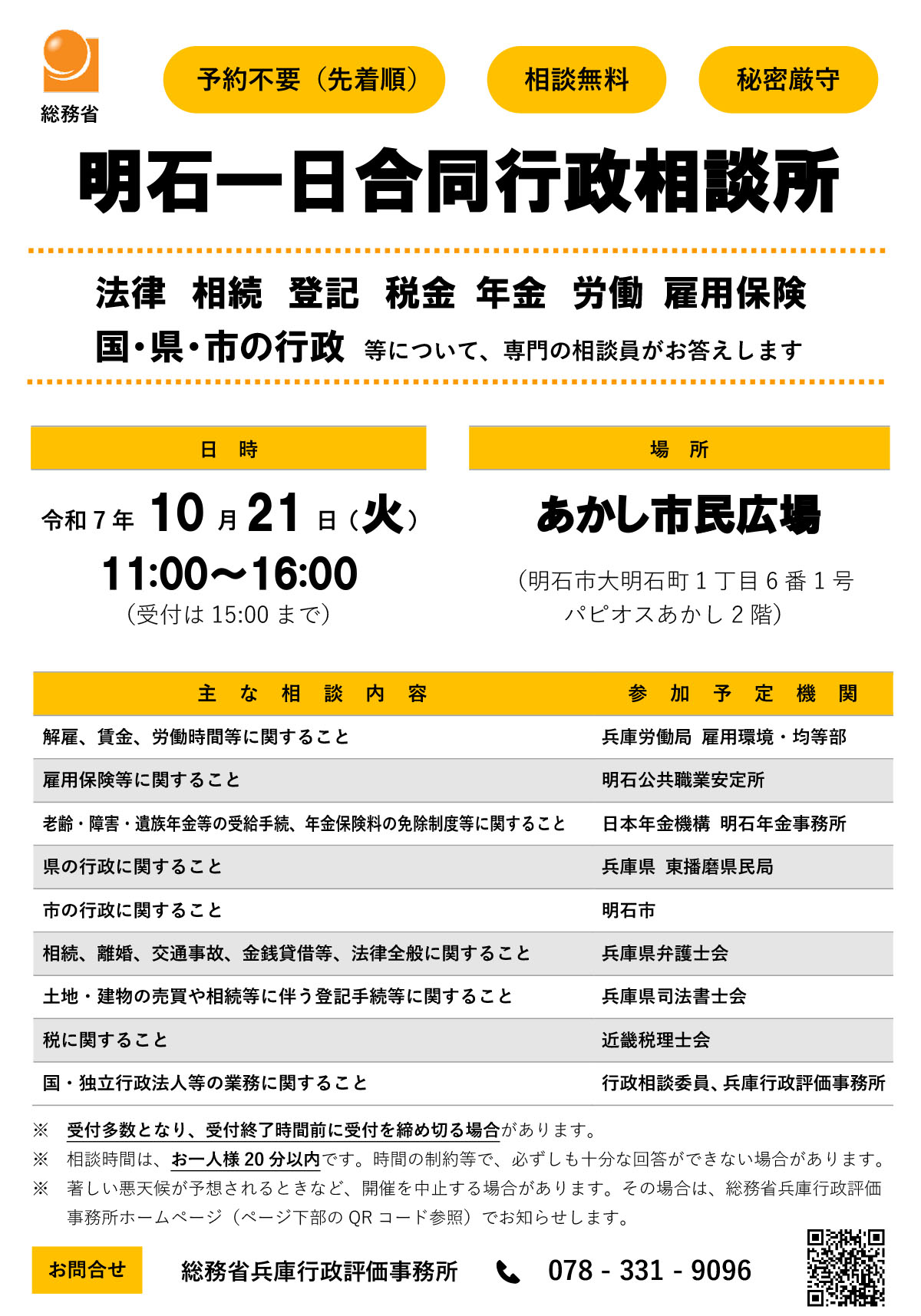 明石駅前の商業施設「パピオスあかし」2階の「あかし市民広場」で弁護士・司法書士・税理士などの専門家や各種行政機関が集まる相談会が「明石一日合同行政相談所」が2025年10月21日(火)に開催されます!