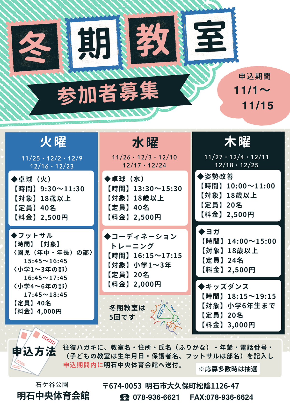 大久保町松陰の明石中央体育館で開催される冬季スポーツ教室の受講生募集が始まっています!