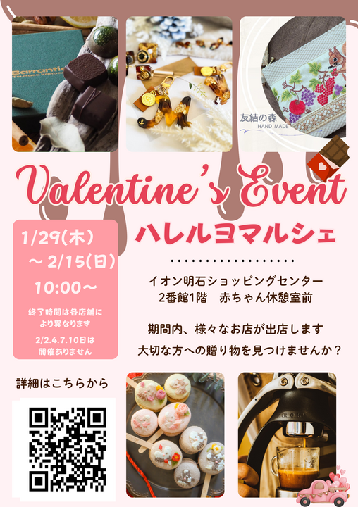 JR大久保駅南側の商業施設「イオン明石ショッピングセンター」2番街1階の赤ちゃん休憩室前で、期間中に約20店舗のショップが出店する「Valentine event 〜バレンタインポップアップショップ〜」が2026年1月29日(木)〜2月15日(日) の期間開催されます!
