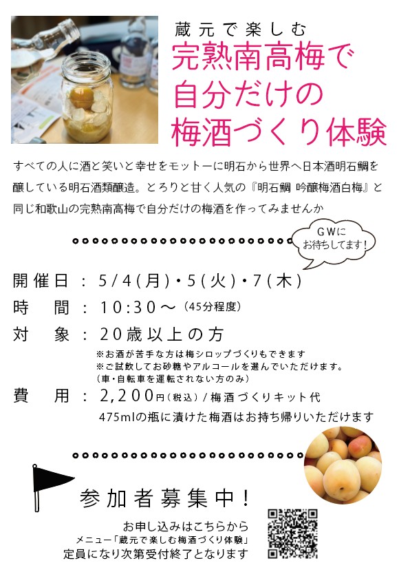 明石酒類醸造&海峡蒸溜所ビジターセンターで「完熟南高梅で自分だけの梅酒づくり体験」が5月4日・5日・7日開催!