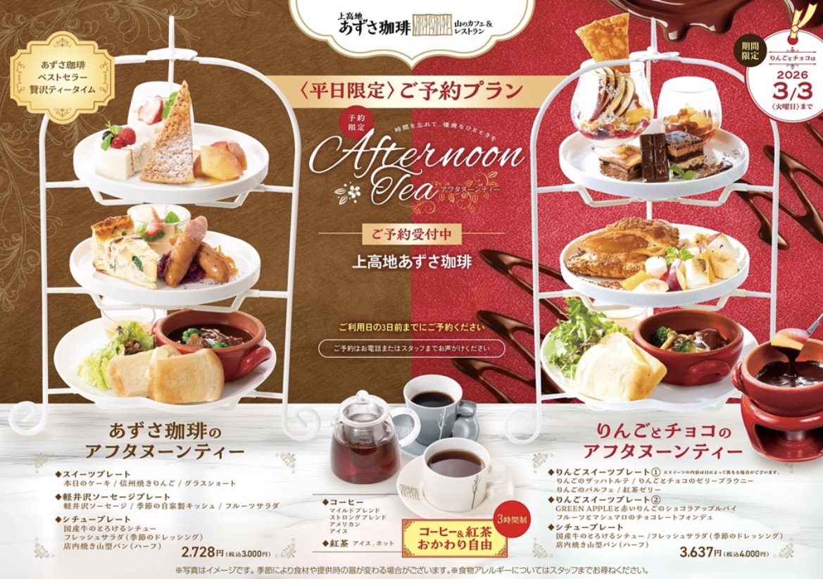 明石周辺では伊川谷町潤和などに店舗のある「上高地あずさ珈琲」の一部店舗で、平日予約限定の「りんごとチョコのアフタヌーンティー」が2025年12月3日(水)~2026年3月3日(火)の期間販売されます!