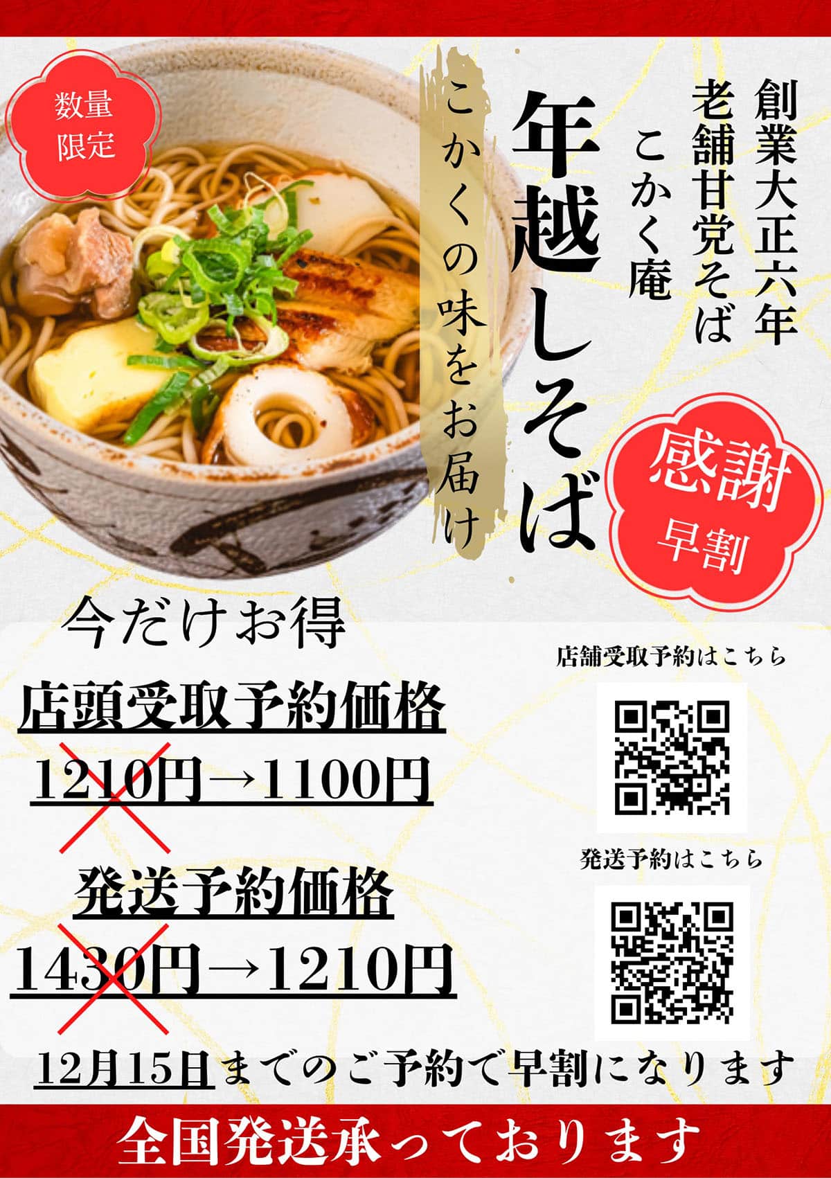 創業大正6年で100年以上の歴史を持つ明石の老舗の甘味処「こかく庵」で年越しそばの予約受付が始まっています!