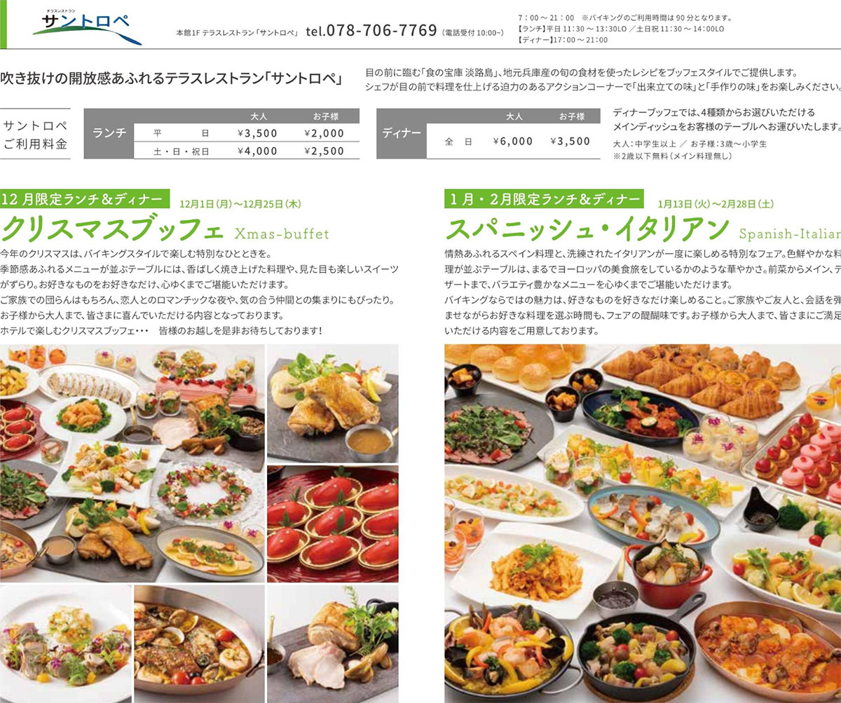サントロペのクリスマスビュッフェでは地元である兵庫の食材や旬の食材を取り入れた、さまざまなジャンルのメニューが50種類以上並びます。詳細なメニューや料金は公式ホームページや舞子ビラニュースをチェック!