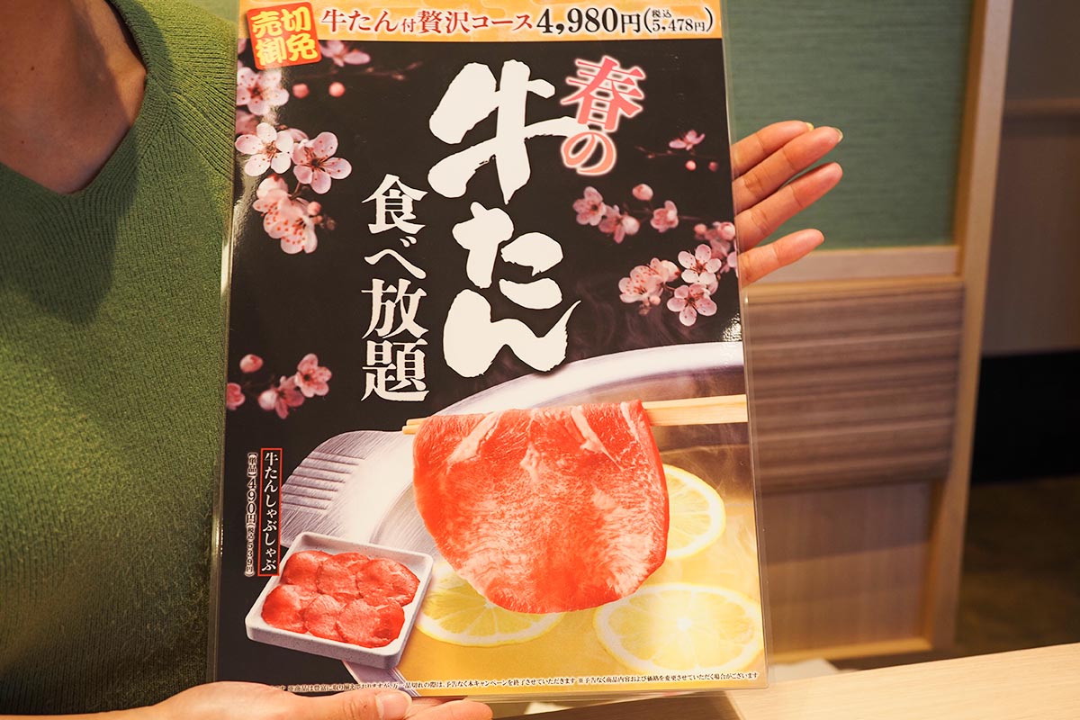 また、「春の牛たん食べ放題」として「牛たん付き 贅沢コース」の提供もスタートしており、こちらは贅沢コースに牛たん食べ放題が追加されるプレミアムなコースとなっています!