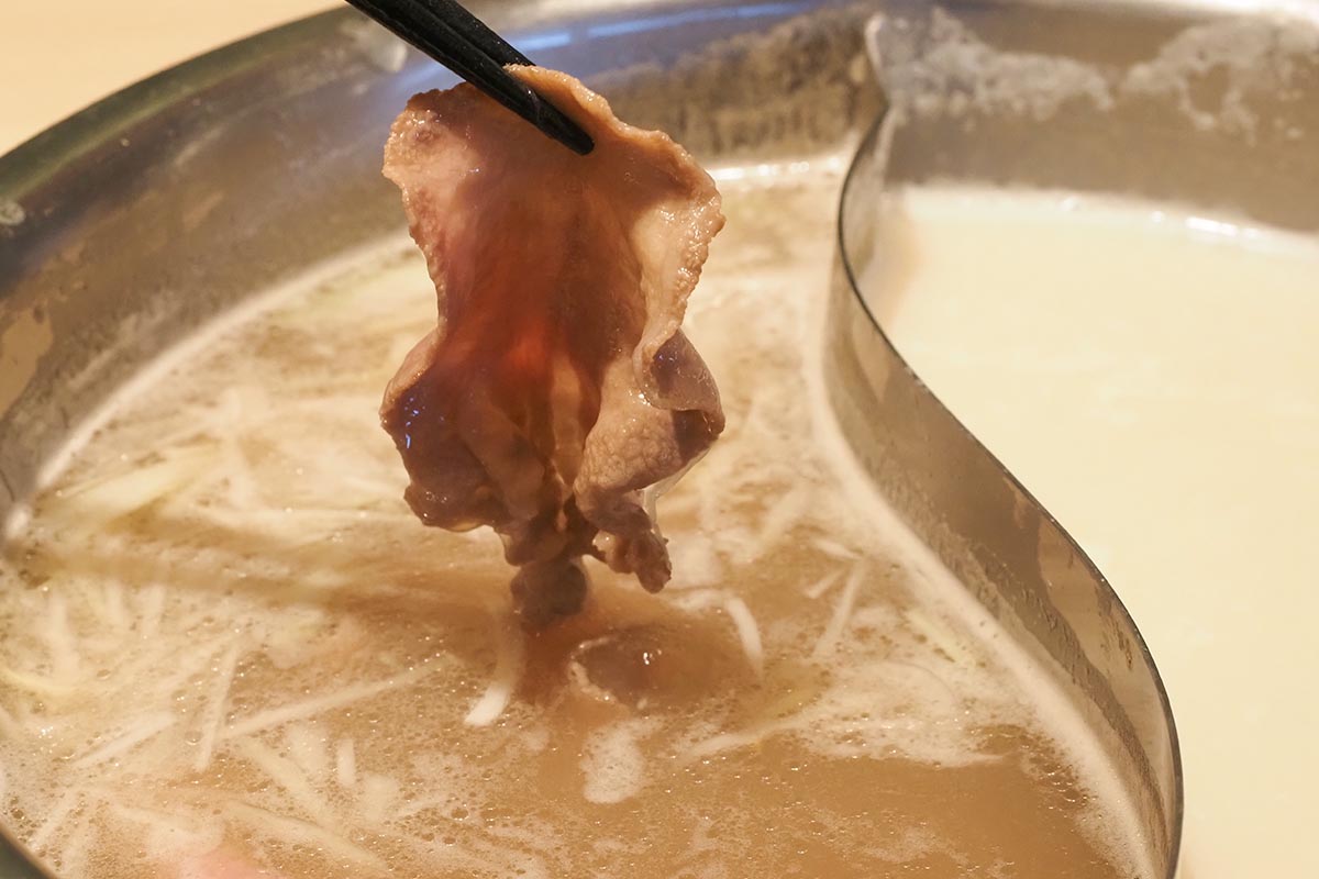 牛タンはタン元と舌先をバランスよく提供。レモンの酸味と塩味がベストマッチする「塩レモンだし」で早速しゃぶしゃぶ・・・サッと火が通ります!
