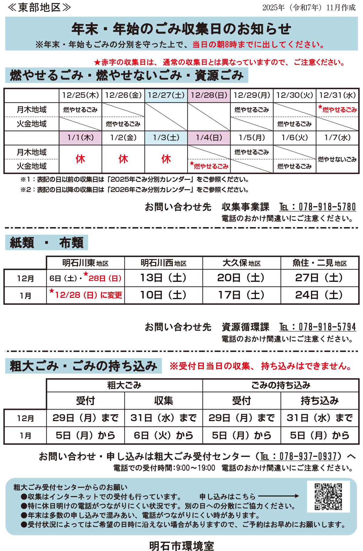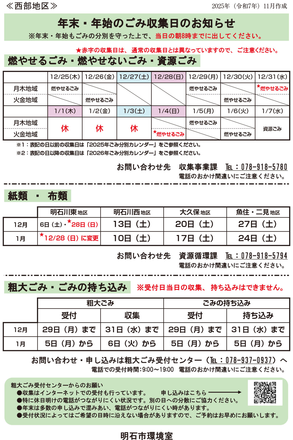 市役所本庁舎の行政情報センター・あかし総合窓口・各市民センター(大久保・魚住・二見)・各サービスコーナー(明舞・西明石駅前・高丘・江井島)に「年末年始のごみの収集日のお知らせ」と「2026年版ごみ分別カレンダー」が用意されているようです。