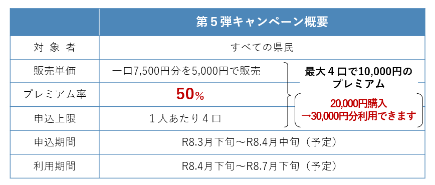 県によると、1口7500円分の利用ができるデジタル商品券を5千円で購入でき、申し込みは1人4口まで。約372万口を準備する。1人4口で申し込んだ場合、93万1千人分に当たる。県内の店舗など約1万4千カ所で使用できる。
