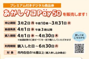 明石市が販売するプレミアム率50%のプレミアム付きデジタル商品券「あかしタコPay50」の購入申込も2026年3月2日(月)10:00からスタートしていますので、こちらもお忘れなく!
