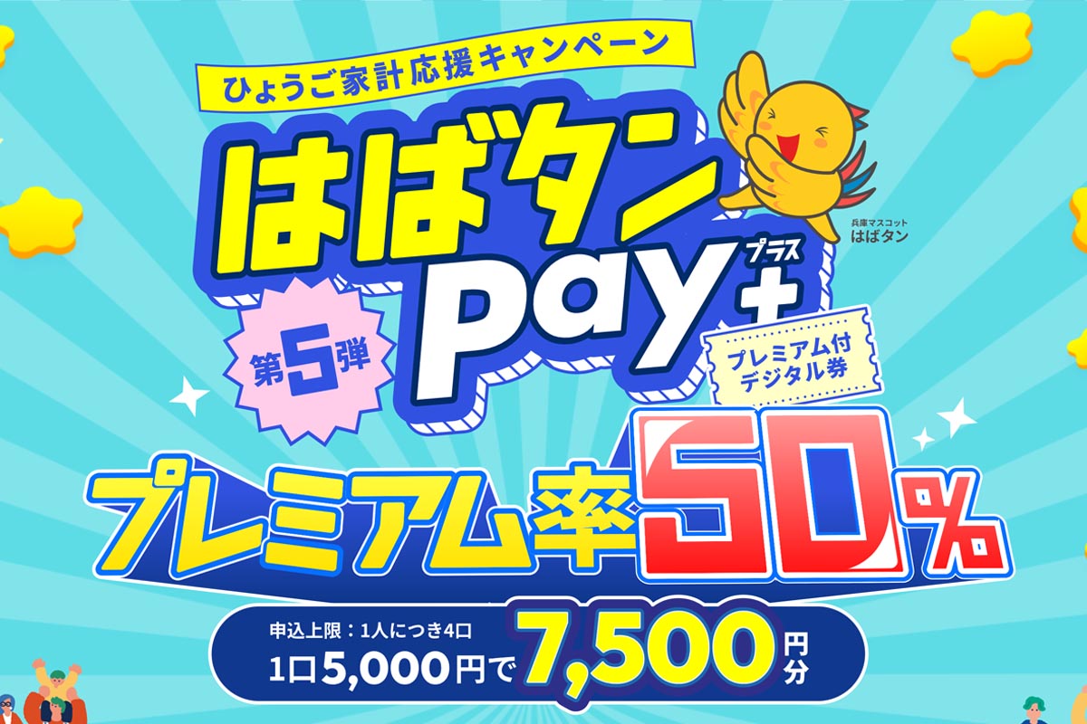 兵庫県内のキャンペーン登録店舗で利用できるスマホアプリを活用したプレミアム付デジタル券「はばタンPay+第5弾」の申込が2026年3月18日(水)からスタートされます!