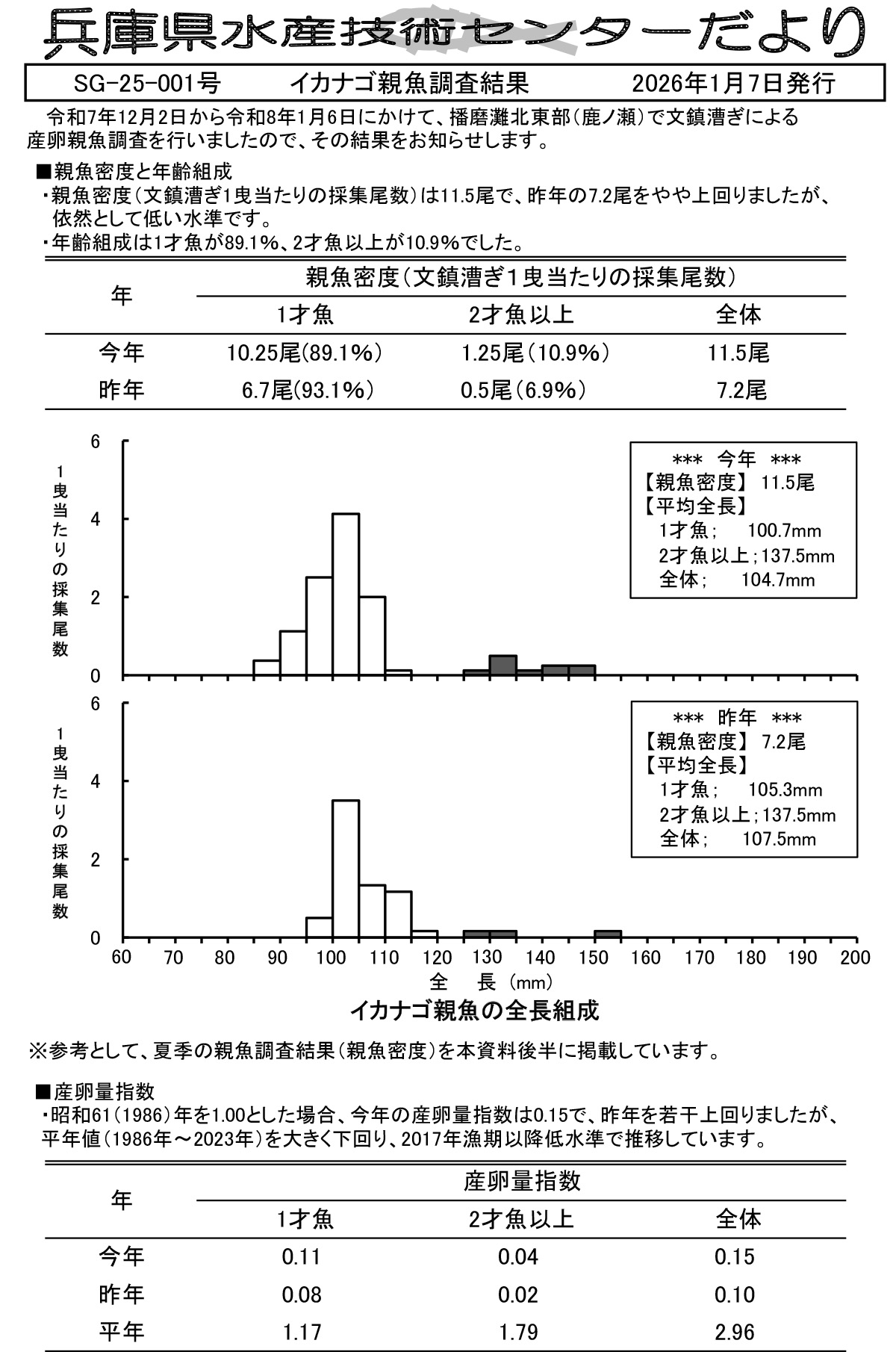 親魚密度(文鎮漕ぎ1回当たりの採集尾数)は11.5尾で、昨年の7.2尾よりも増加していますが、不漁が始まった2017年以前に比べると引き続き低い値です。昭和61年を1.00とした場合の今年の産卵量指数は0.15となり、こちらも昨年の0.10と比べると高くなっていますが、平年を下回る低い値となっています。今後は1月下旬に稚仔の分布調査が行われ、イカナゴシンコ漁況予報が2月中旬頃に公表される予定です