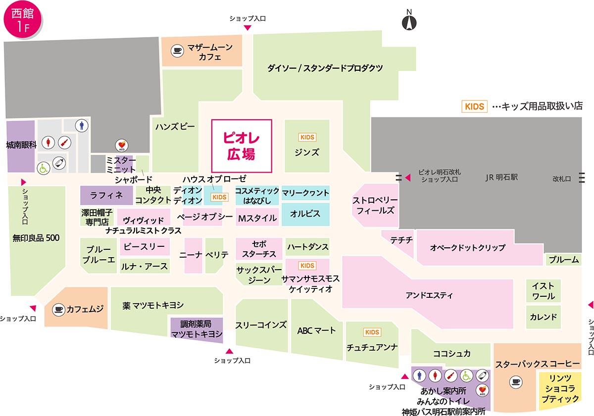ピオレ明石改札は駅直結の商業施設「ピオレ明石」の西館と繋がっており、「Standard Products(スタンダードプロダクツ)ピオレ明石店 / DAISO(ダイソー)ピオレ明石店」と「STRAWBERRY-FIELDS(ストロベリーフィールズ)」の間に出るようになっています