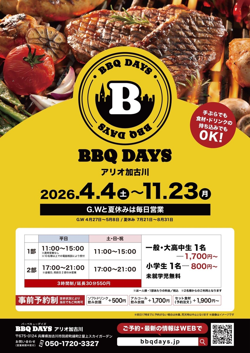 加古川市別府町緑町の商業施設「アリオ加古川」に、屋上バーベキュー会場「BBQ DAYS(バーベキューデイズ)アリオ加古川」が2026年4月4日(土)~11月23日(月・祝)の期間限定でオープンされます!