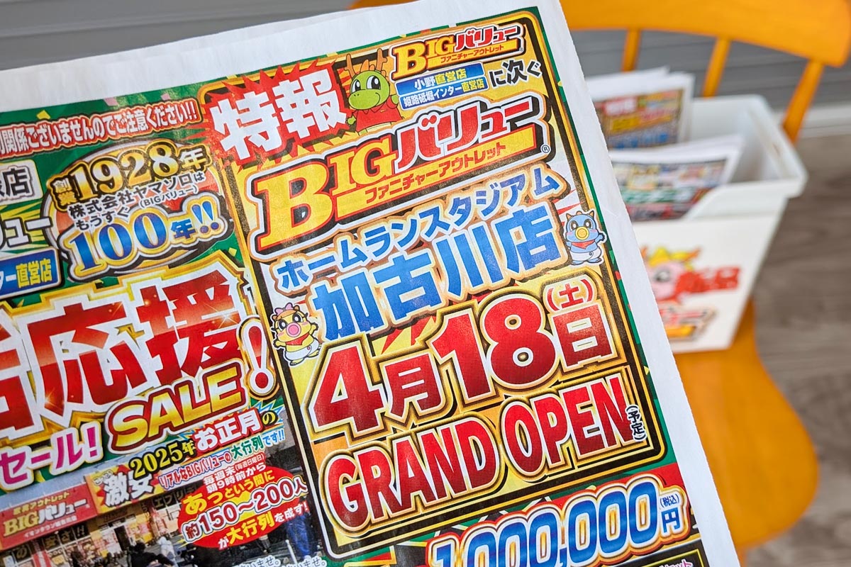加古川市尾上町安田にある「メガコート加古川」1階に、アウトレット家具店の「BIGバリュー ホームランスタジアム加古川店」が2026年4月18日(土)にオープン予定です!