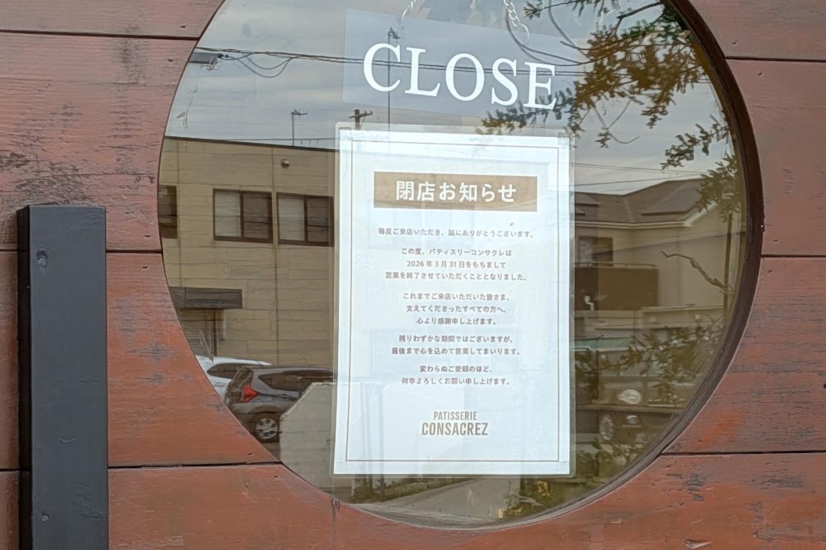 玉津IC近く神戸市西区宮下に本店があった洋菓子店「PATISSERIE CONSACREZ(パティスリー コンサクレ)」が2026年3月31日(火)をもって全店舗閉店されていました!