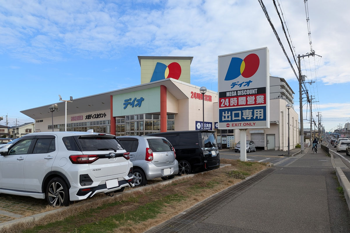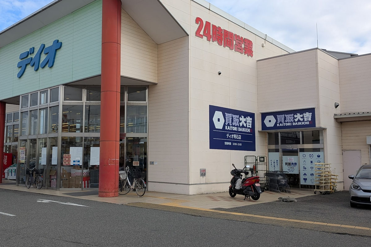 24時間営業のディスカウントストア「ディオ明石店」の一角で、以前はクリーニング店があった場所になります。既に看板などが設置されており「2026.1.14~ OPEN 買取大吉ディオ明石店」と書かれていました