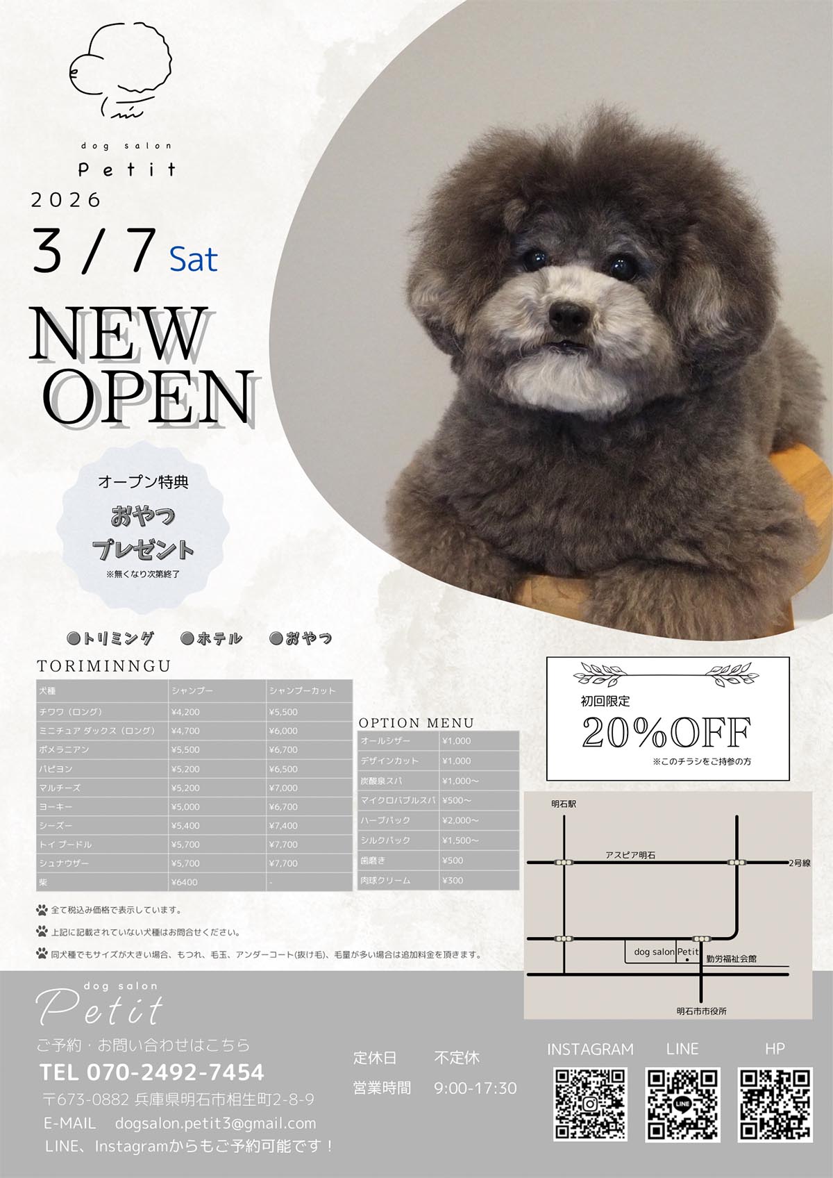 情報を頂いて調べたところ公式サイトや公式Instagramが開設されており、2026年3月7日(土)にオープンされたそうで、トリミング利用者向けにペットホテルもされています。トリミングメニューやオプションの価格表はチラシデータをチェック!