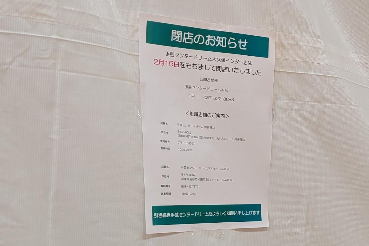 以前から閉店セールが実施されていましたが、告知されていた通り2026年2月15日(日)をもって閉店されたようです。近隣店舗としては「手芸センタードリーム 舞多聞店」や「手芸センタードリーム アイモール高砂店」が紹介されています