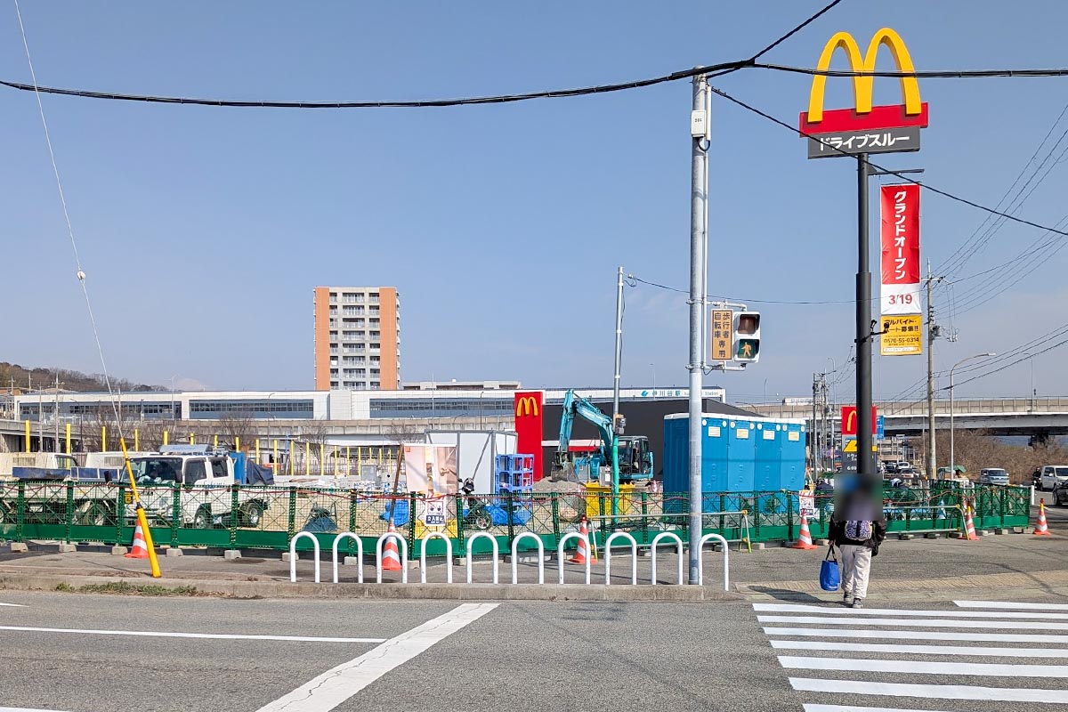 この場所には元々ホームセンターの「ロイヤルプロ 伊川谷」があった場所ですが、2025年1月31日(金)をもって閉店されていました。道を挟んで向かいには分譲マンションと「マクドナルド 伊川谷駅前店」の工事が進められており、マクドナルドは2026年3月19日(木)にオープン予定となっています