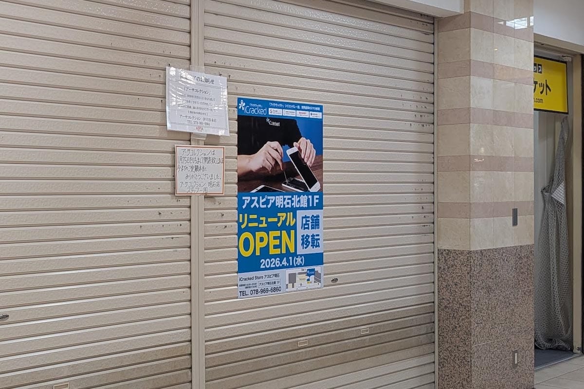 明石駅前の商業施設「アスピア明石」北館3階にあるスマホ修理店のiCracked Store(アイクラックトストア)アスピア明石店が2026年4月1日(水)に移転してリニューアルオープン予定です!