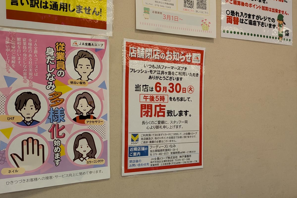 県道718号線沿いにある「JAファーマーズプチ フレッシュ・モア 江井ヶ島」が2026年6月30日(火)17:00をもって閉店されるそうです!
