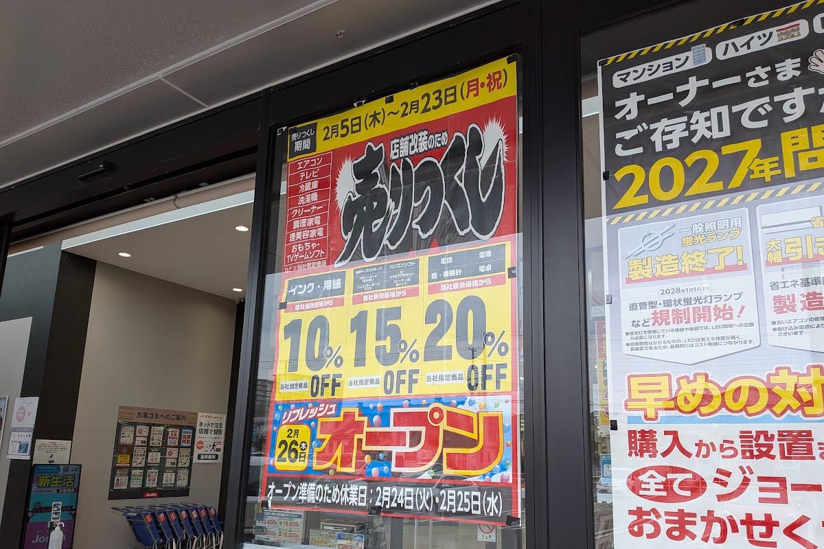 硯町の商業施設「トンボプラザ」内にある家電量販店「Joshin(ジョーシン)明石店」が店舗改装のため2026年2月24日(火)・25日(水)の2日間臨時休業されるようです!