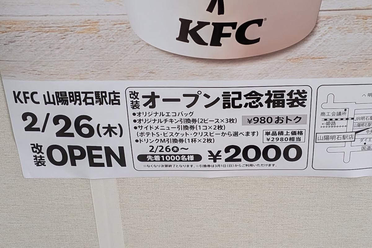 明石駅構内にある「ケンタッキーフライドチキン山陽明石駅店」が店舗改装工事のため休業されていますが、2026年2月26日(木)にリニューアルオープンされることが告知されており、先着で改装オープン記念福袋が販売されるそうです!