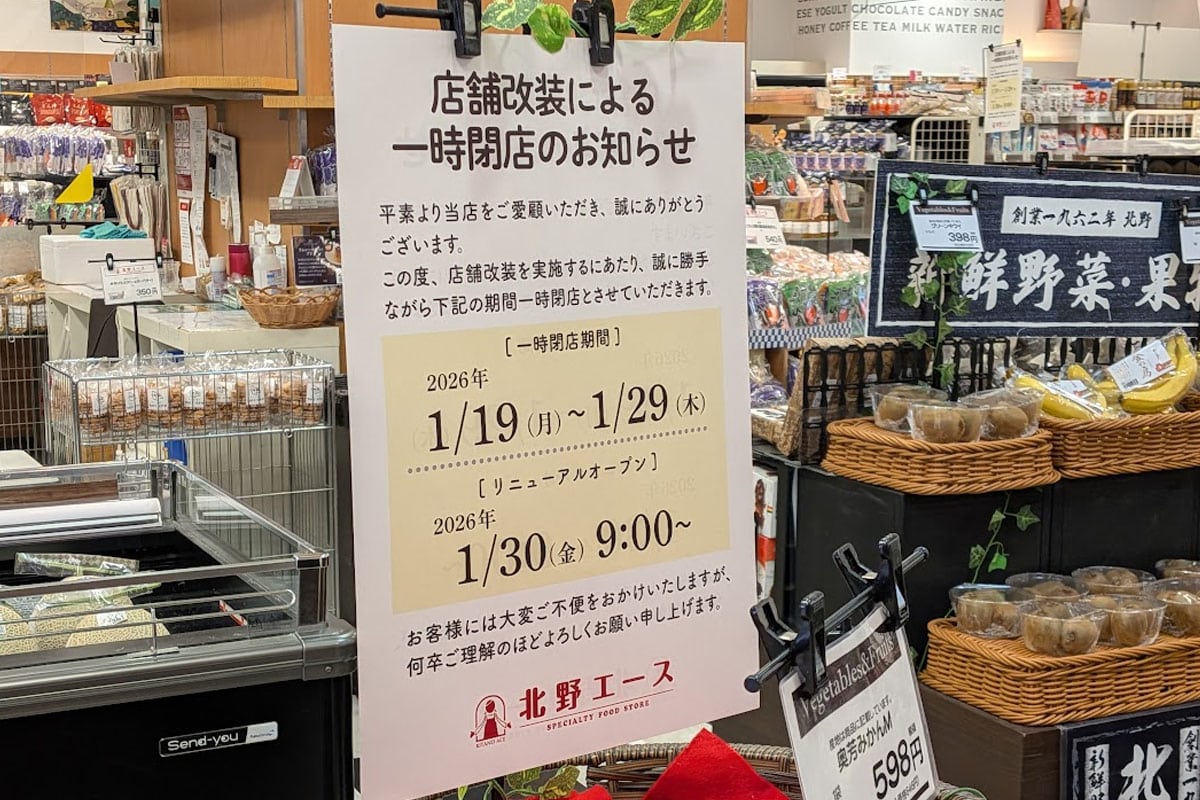 JR西明石駅直結の商業施設「PLiCO NISHIAKASHI(プリコ西明石)」1階にあるスーパーマーケット「北野エース 西明石店」が店舗改装のため2026年1月19日(月)~29日(木)の期間休業されるようです!