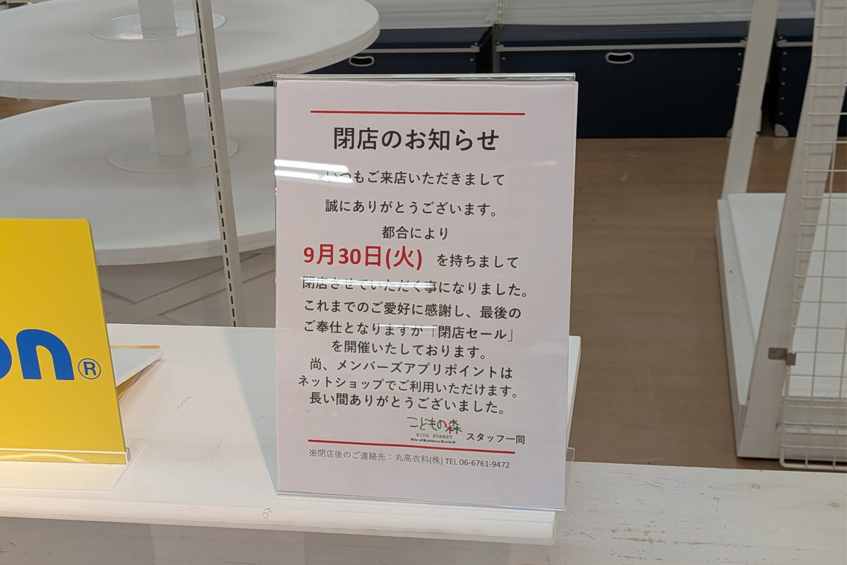 以前から閉店セールが実施されていましたが、告知されていた通り2025年9月30日(火)をもって閉店されたようです。こどもの森は丸高衣料株式会社が運営する子ども服コーナーで、メンバーズアプリポイントに関してはネットショップで利用が可能とのことです