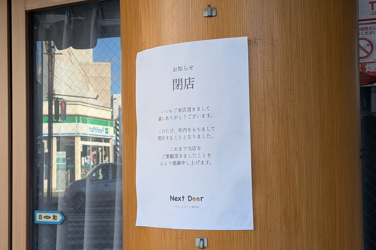 以前から告知されていた通り、2025年12月31日(水)をもって閉店されたようです。Next Doorは2021年10月にプレオープン、11月に正式オープンされており、公式Instagramにも閉店の告知が掲載されていました