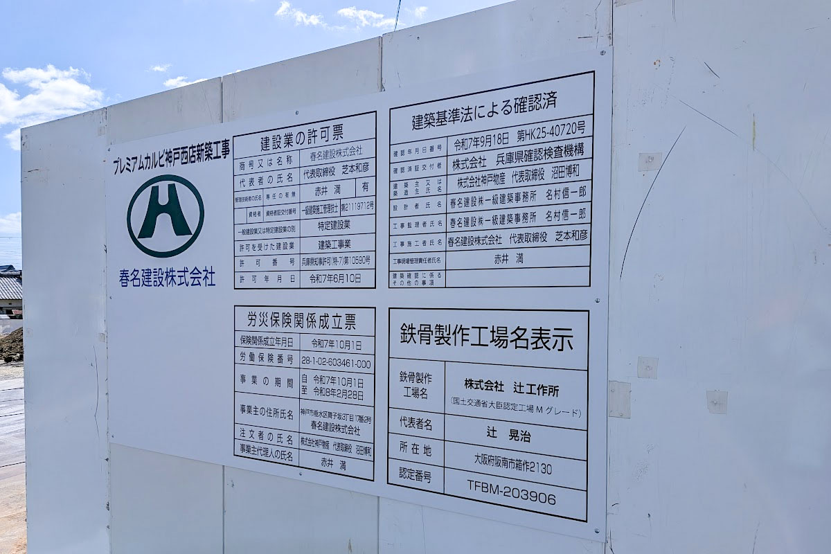 情報を頂いて現地を確認したところ工事が始まっていました。「プレミアムカルビ神戸西店新築工事」と書かれており、労災保険関係成立票に記載されている事業の期間は令和7年10月1日~令和8年2月28日とされていました