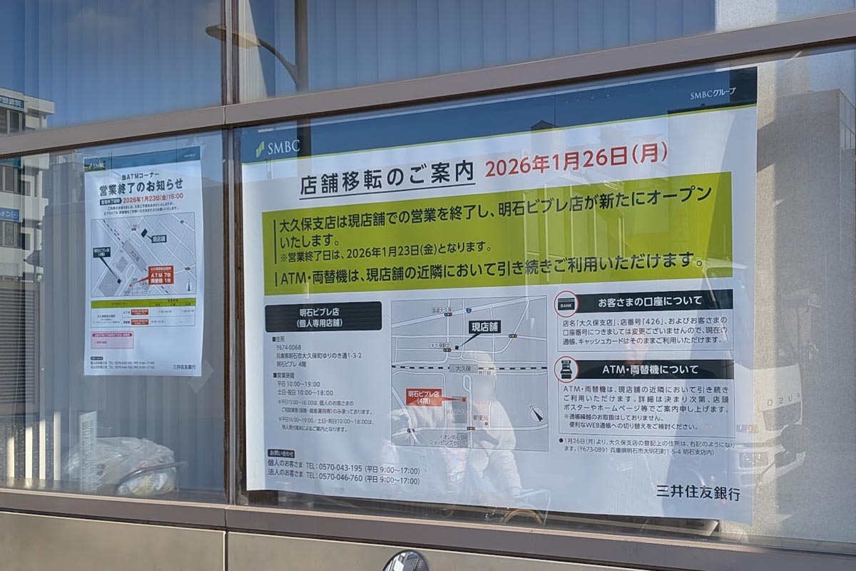明石ビブレ4階に「三井住友銀行」が1月26日オープン予定!JR大久保駅北側の店舗は1月23日で営業終了